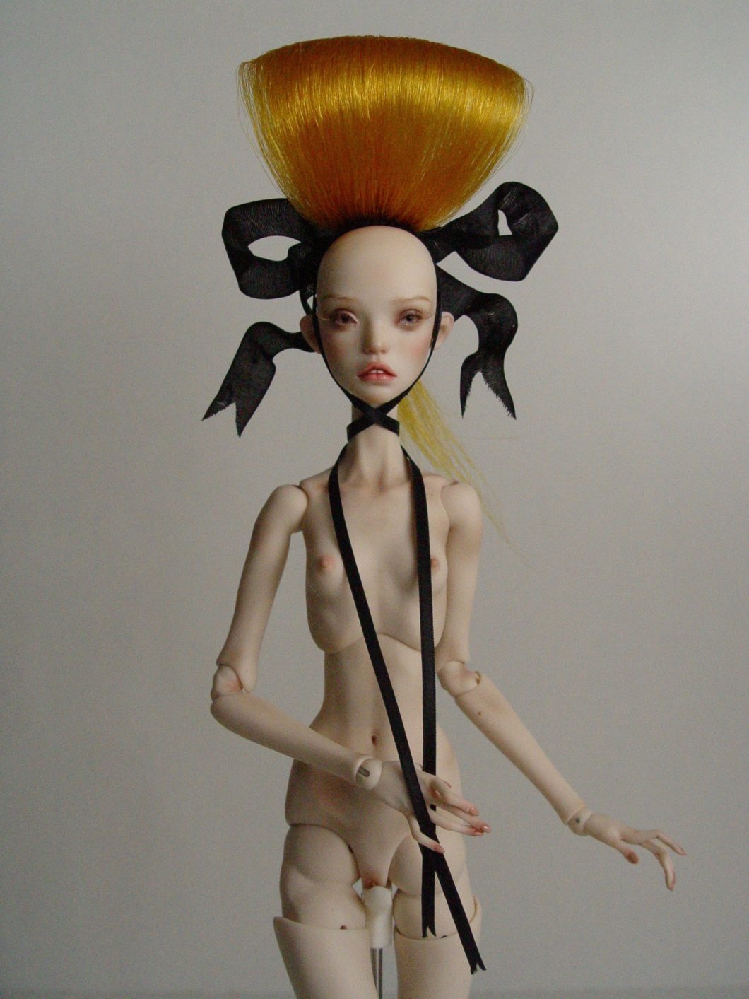 Headpiece wig, made with lemon yellow colored camel hair, black silk ribbons and vintage stiff millinery mesh. For Popovy, Pasha mini / original and Marmite Sue dolls. For other wig sizes, please message me.